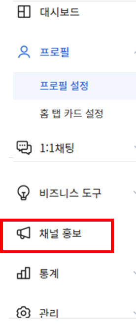5.오른쪽 메뉴에 아래로 내리다 보면 채널 홍보라는 문구가 보이고 선택합니다