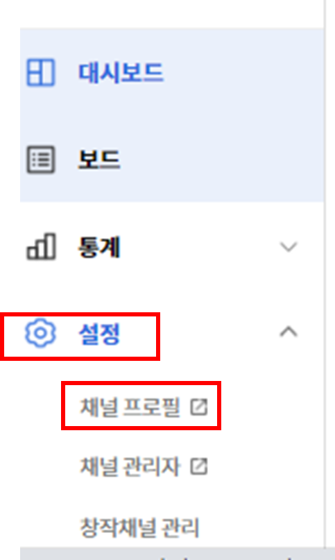 3.오른쪽 메뉴에 설정 누르시고 채널 프로필 선택합니다
