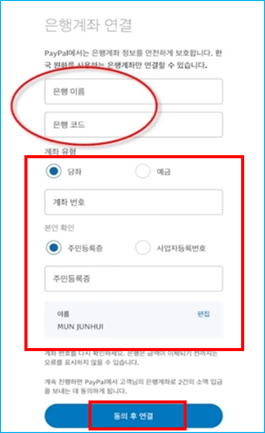 나머지 계좌번호 주민번호 이름 입력 후 동의 후 연결 클릭