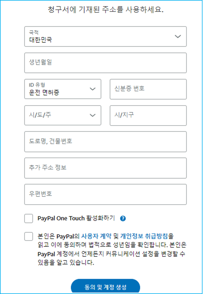 6. 생년월일 신분증 번호 주소(영문) 작성 후 정보동의 후 동의 및 계정 설정