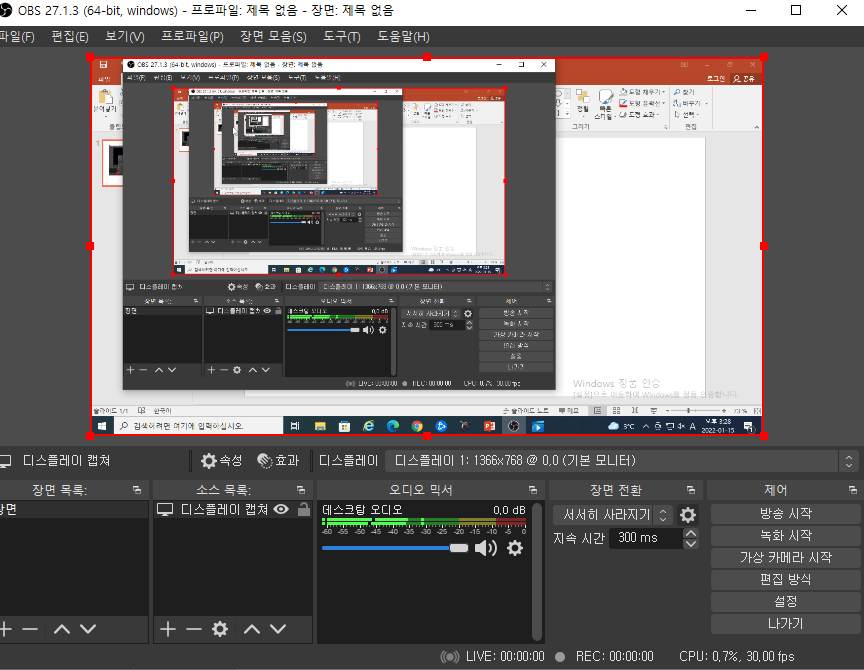 7. 창이 여러 개 보이는 것은 녹화 시작하시고 OBS창을 하단으로 내려서 숨기 기하시면 녹화가 윈도 화면만 됩니다