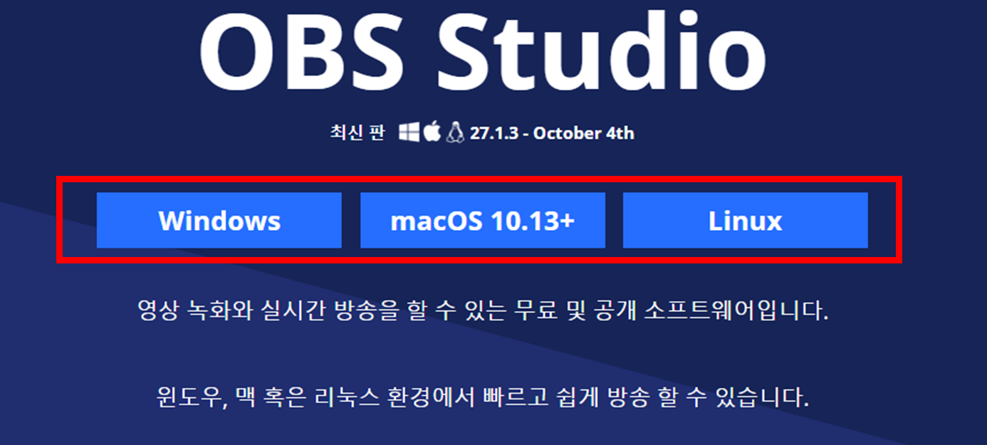 OBS Studio 홈페이지 2. 그럼 자신에게 맞는 조건으로 파란 버튼을 눌러 다운 후 설치합니다 저는 windows 설치 진행하였습니다