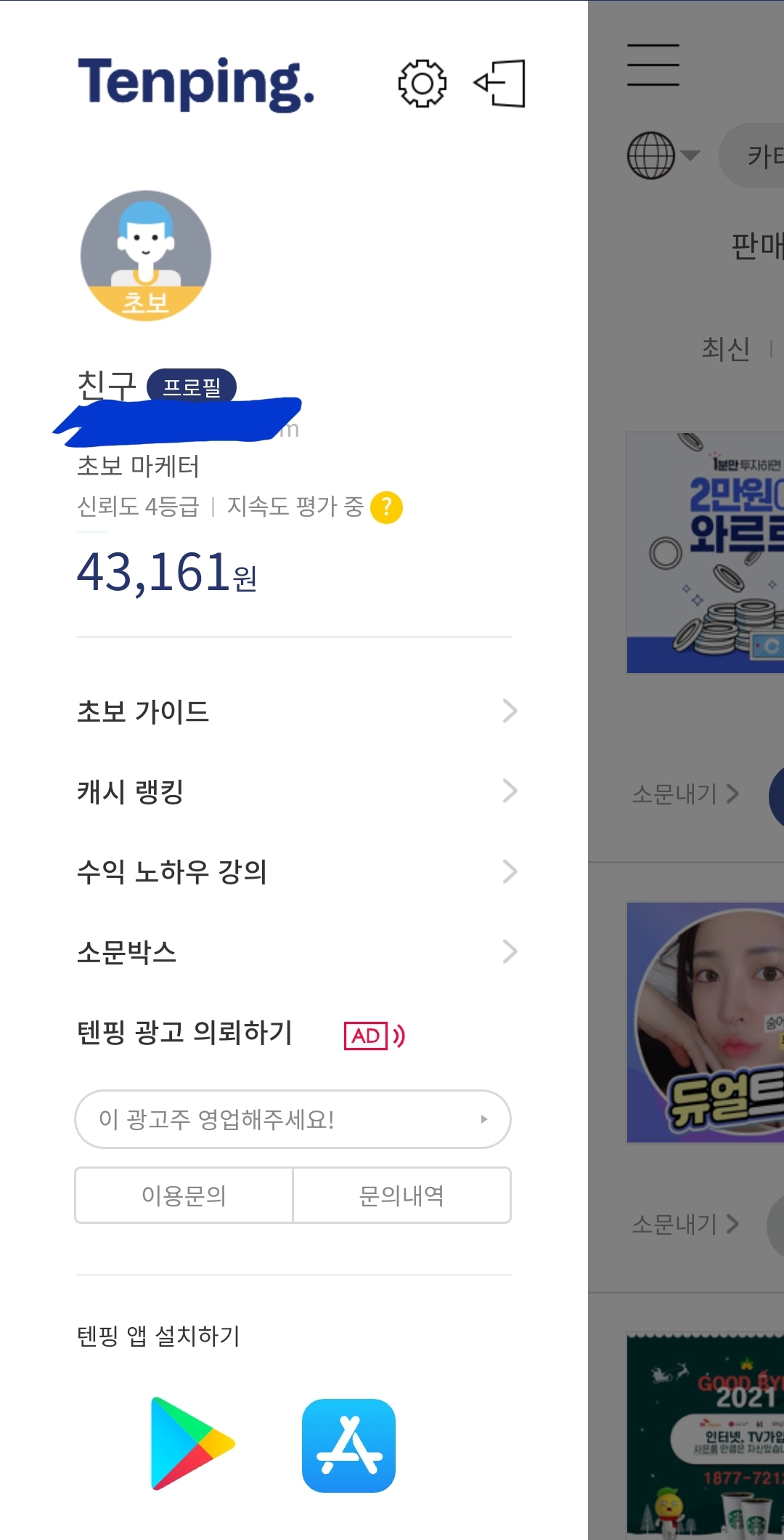 소문내고 현금 포인트를 받는 국민부업 앱 '텐핑'