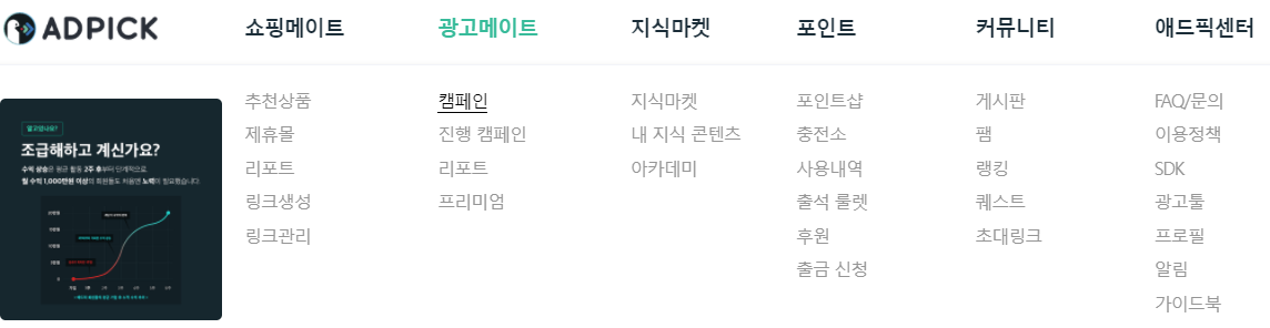 애드픽 상단에 메뉴입니다