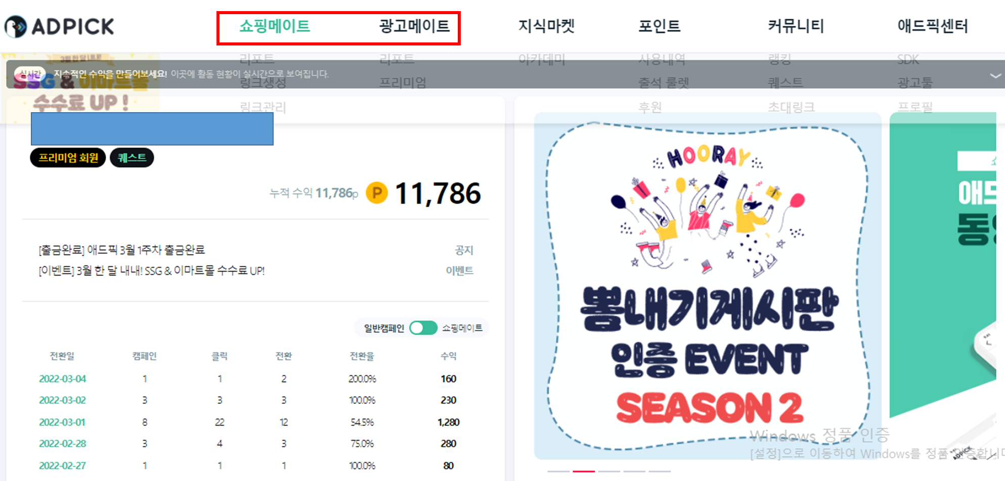 전 상단에 보이시는 쇼핑 메이트 광고 메이트 두 개만 해보았습니다