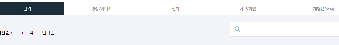 광고 메이트는 아래 그림처럼 클릭, 영상/이미지 , 설치, 예약/이벤트, 체험단 메뉴가 있습니다